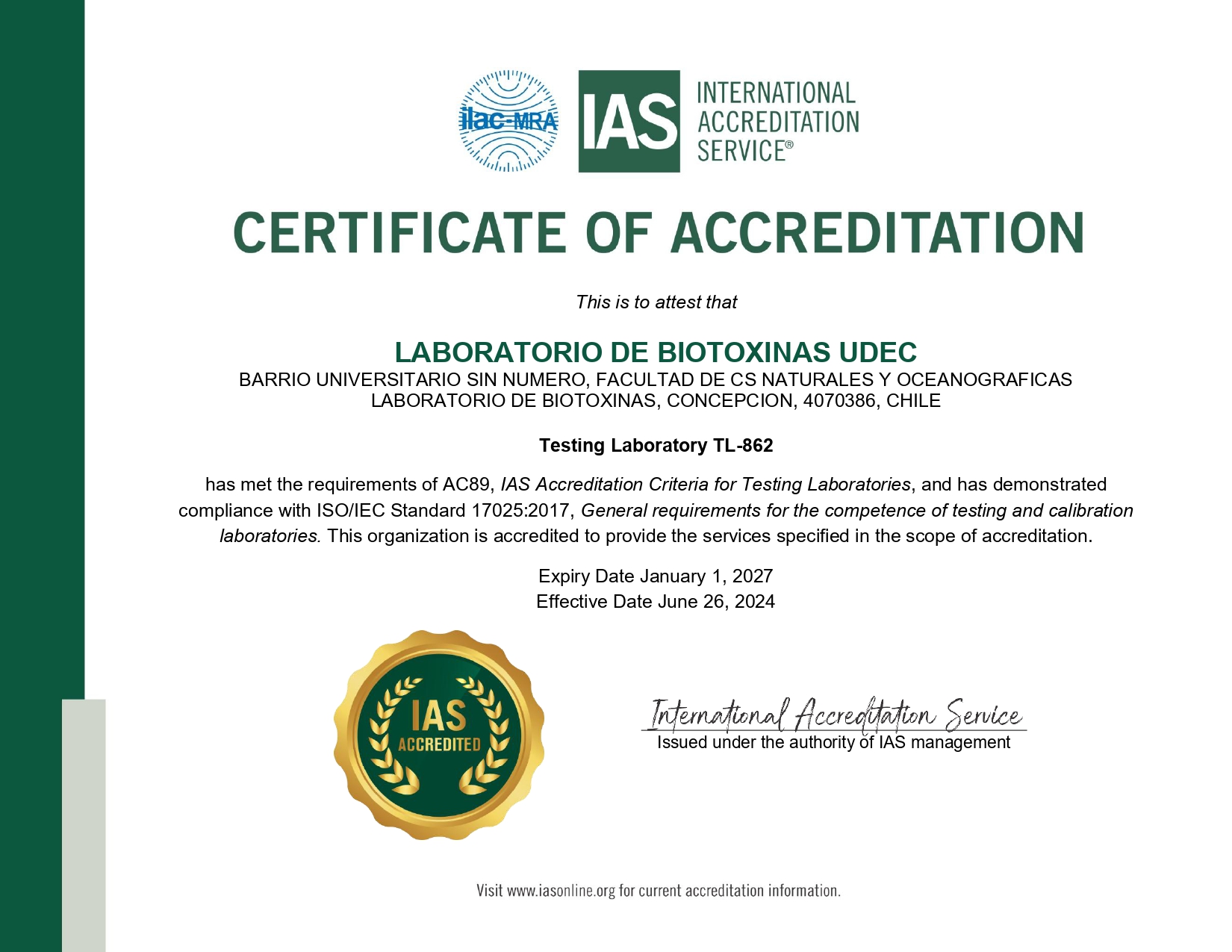 LBTx-UdeC es el primer laboratorio de detección de toxinas marinas de la región del Biobío y durante el primer año de funcionamiento obtuvo la acreditación ISO17025:2017 otorgada por The International Accreditation Service (IAS).La certificación a través de normas de calidad es un elemento diferenciador y altamente valorado que, junto a la gestión de la calidad, contribuye a la mejora continua de las actividades de LBTx-UdeC, siendo parte de los servicios que la Universidad de Concepción ofrece al medio.